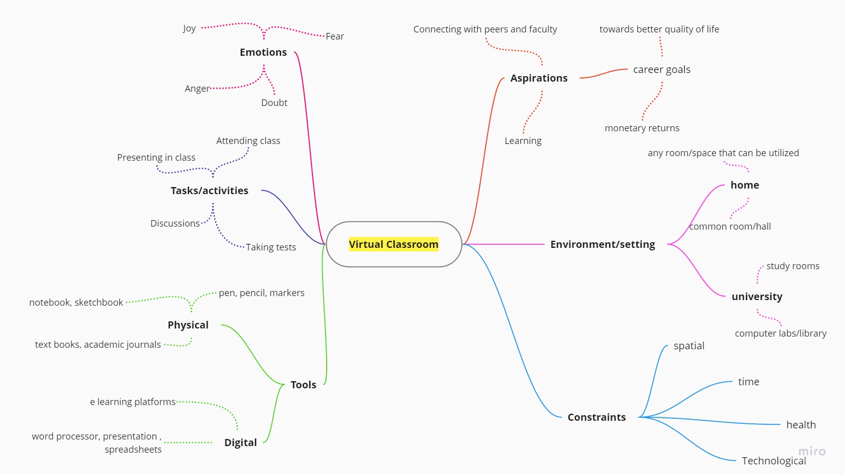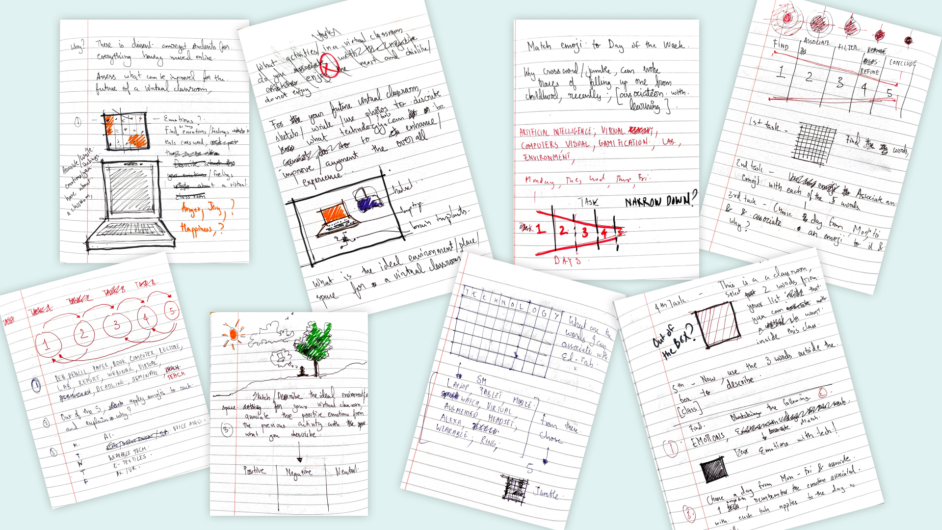 After the probes were returned I analysed them for themes and design inspiration and found that most participants were unhappy, frustrated and often bored of attending classes online. They often wished for a change of scenery at least virtually and suggested the inclusion of immersive technologies to make things interesting. Apart from that user’s also felt a lack of interaction with peers and felt the need to include social media like features within learning platforms.